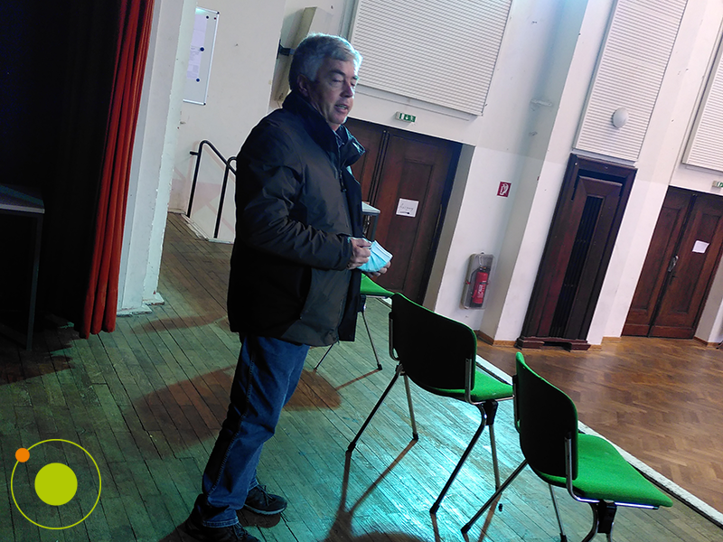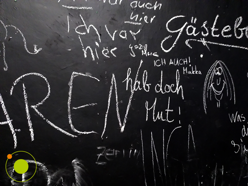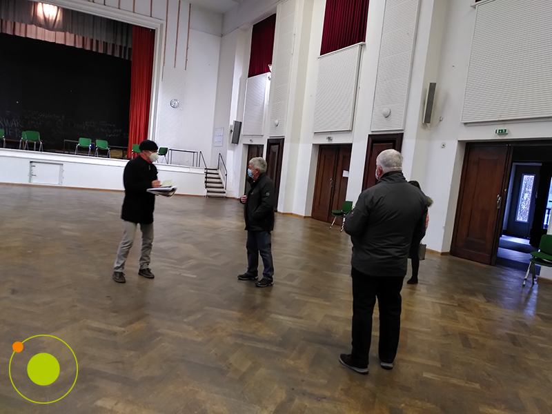 Wir stehen im großen Saal des evangelischen Gemeindezentrums. Welch ein Kontrast. Von außen unscheinbar, birgt der große Raum kaum weniger Platz als das Volkshaus, ist jedoch modern, unterteilbar, mit neuester Technik ausgestattet. Auf der Bühne ein Greenscreen für die aktuellen Adventskalendervideos der Emmaus-Jugend. Und: Im Gegensatz zu Volks- und Kolpinghaus ist das Gebäude barrierefrei.